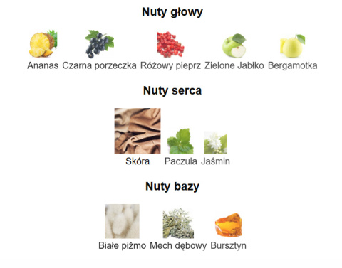 Nuty głowy: ananas, czarna porzeczka, różowy pieprz, zielone jabłko, bergamotka Nuty serca: skóra, paczula, jaśmin Nuty bazy: białe piżmo, mech dębowy, bursztyn